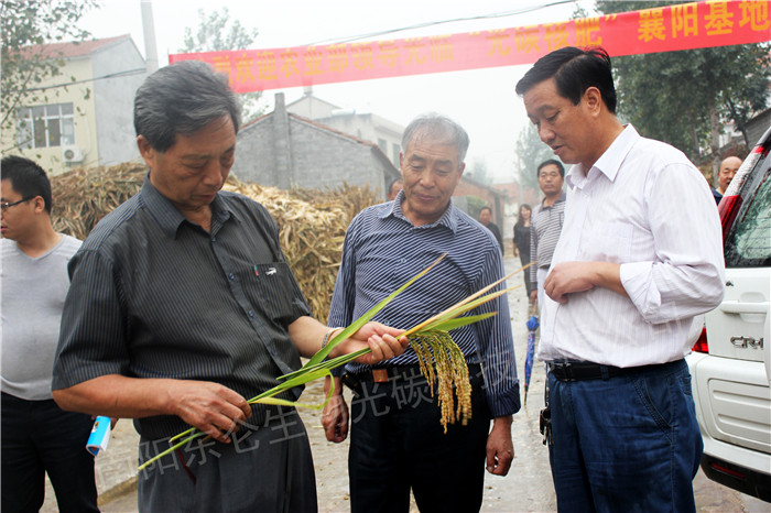 王文德同志親自采摘常規(guī)施肥田稻穗與光碳示范田稻穗認真對比
